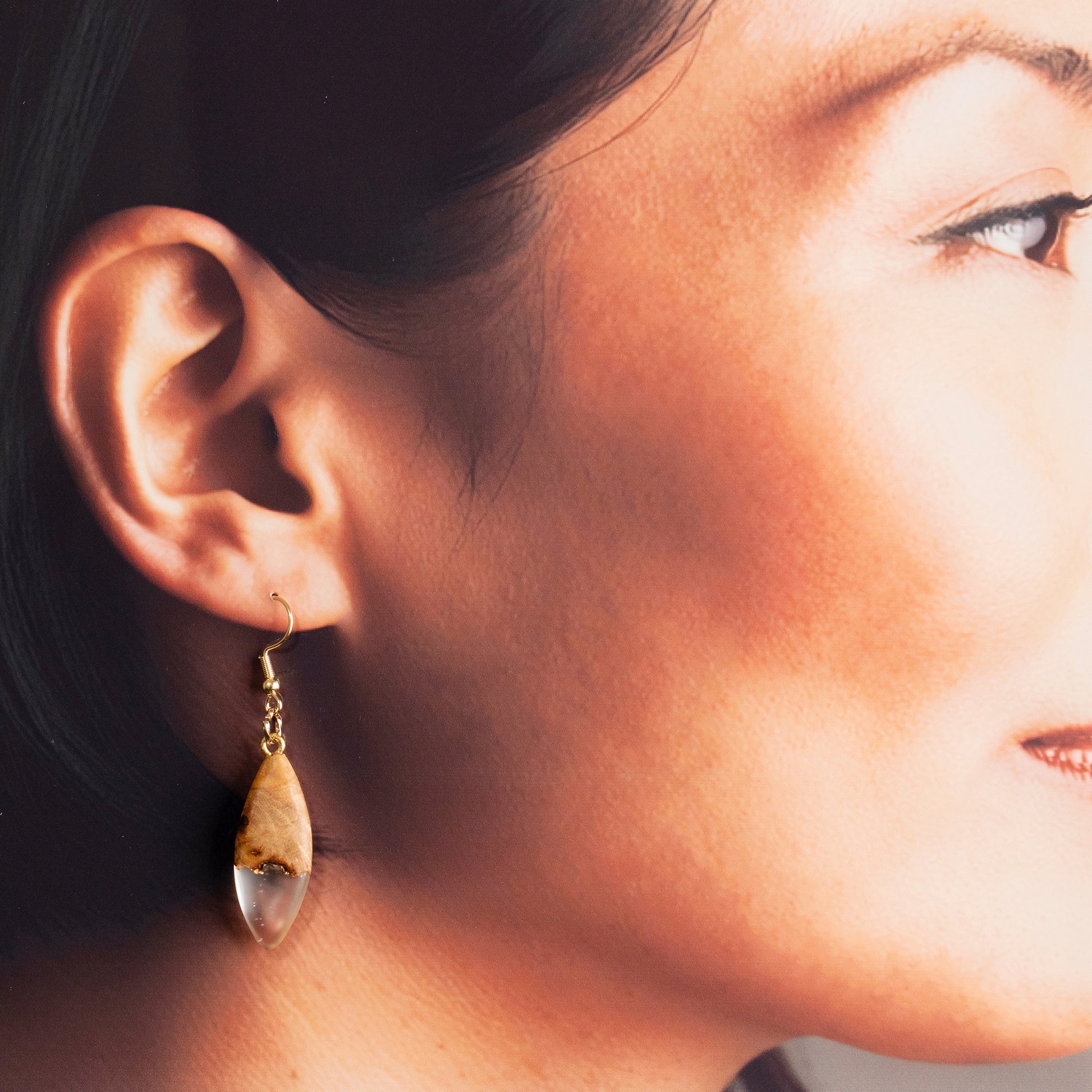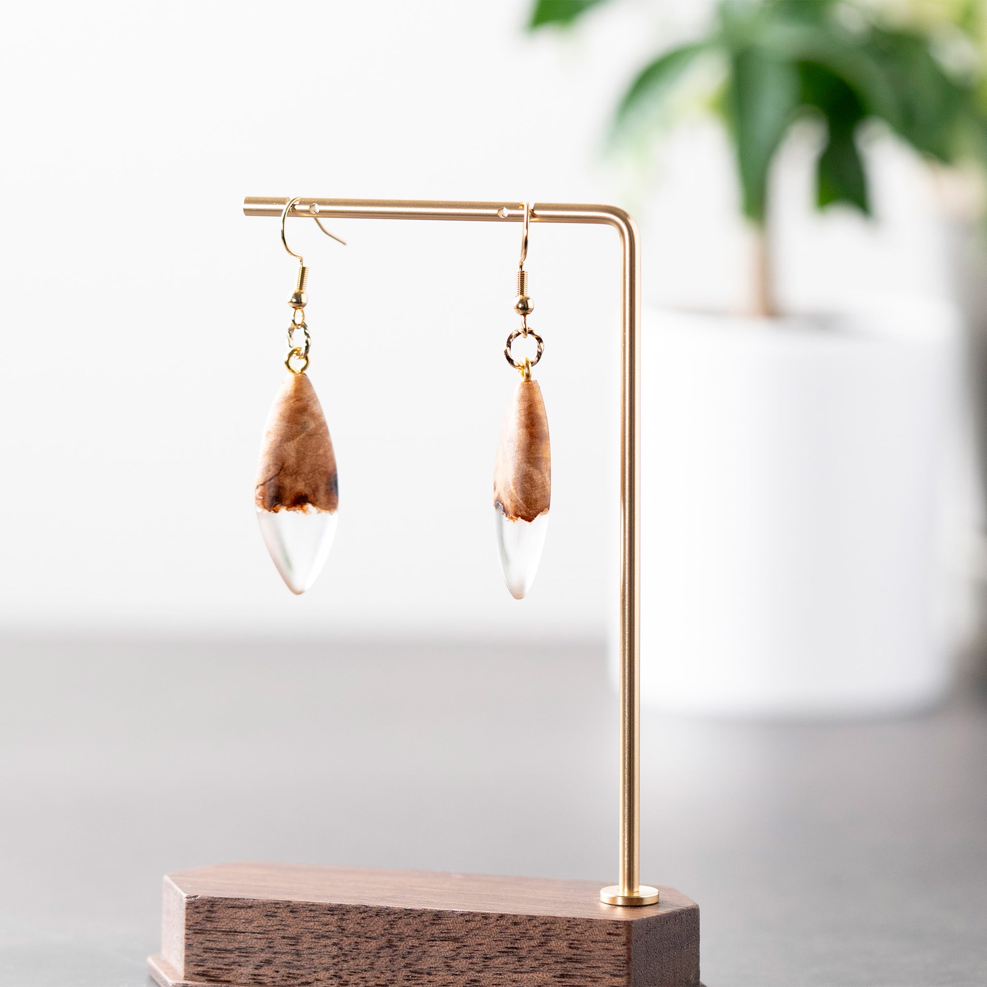 瘤杢×レジンの一点ものピアスは、控えめなのに芯のある存在感。
