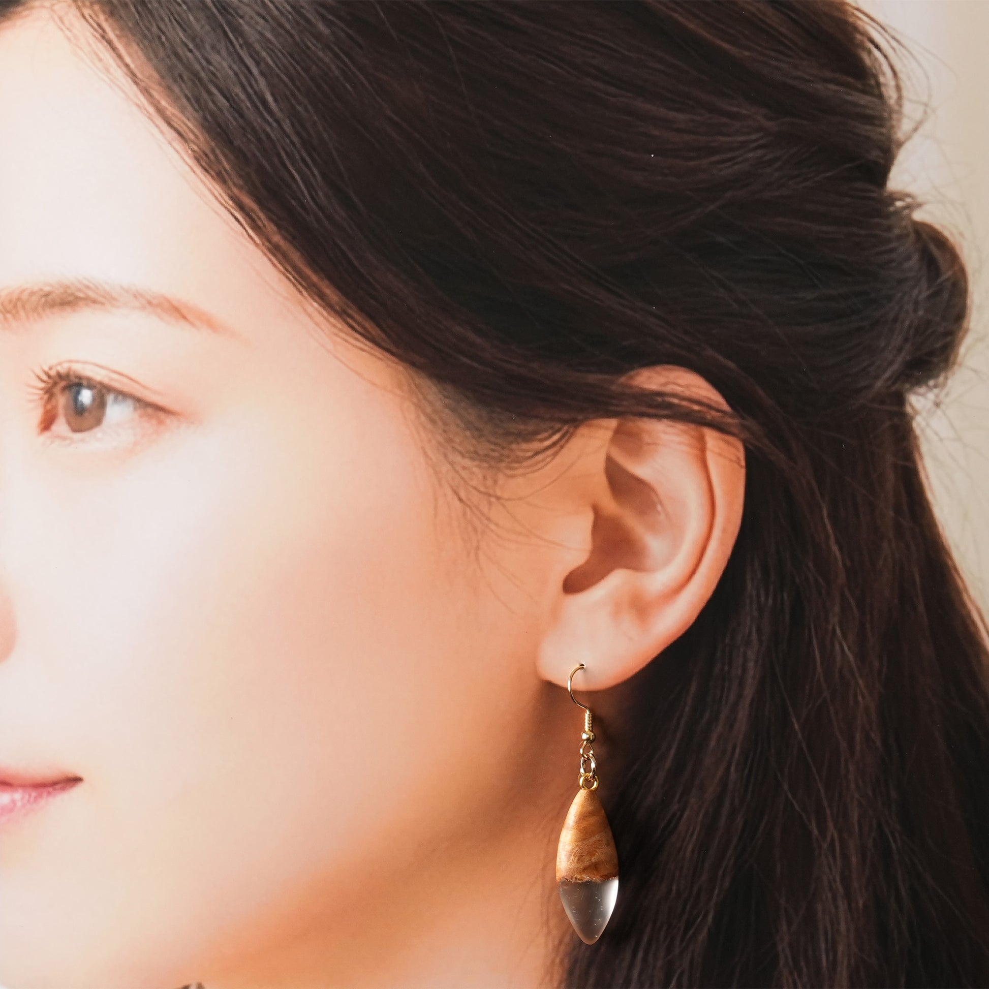 北海道産木材の木目の温かみ×レジンの透明感がまるで天然石を思わせる唯一無二の美をまとう。軽やかで上品な印象のクリアホワイトとわずかに輝くゴールドがアクセント。木目の濃淡や節の表情の掛け合わせをお楽しみください。瘤杢の組み合わせが目を引く一点もののピアスです。