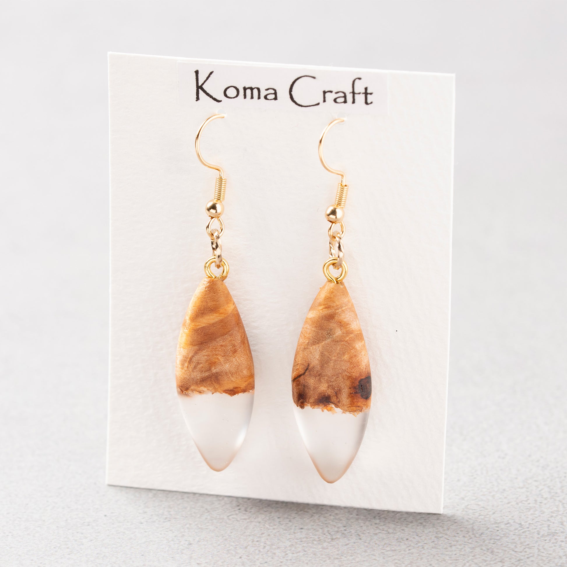<1点もの>【KomaCraft】ピアス(フックピアス) 瘤杢×レジン (ドロップ型・クリア)