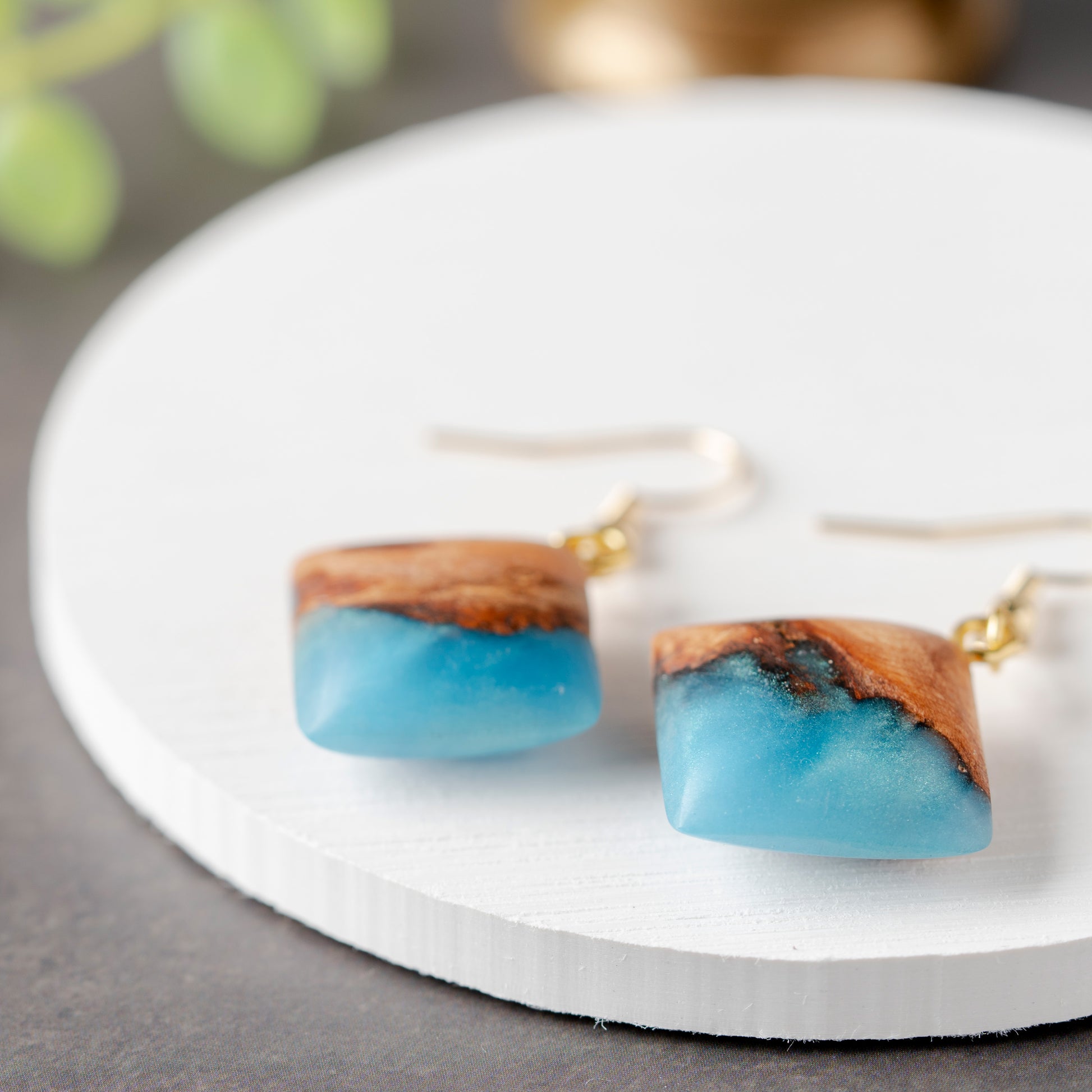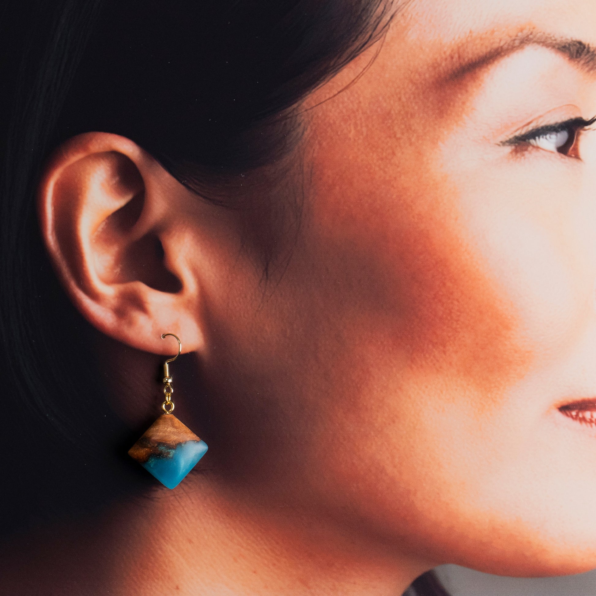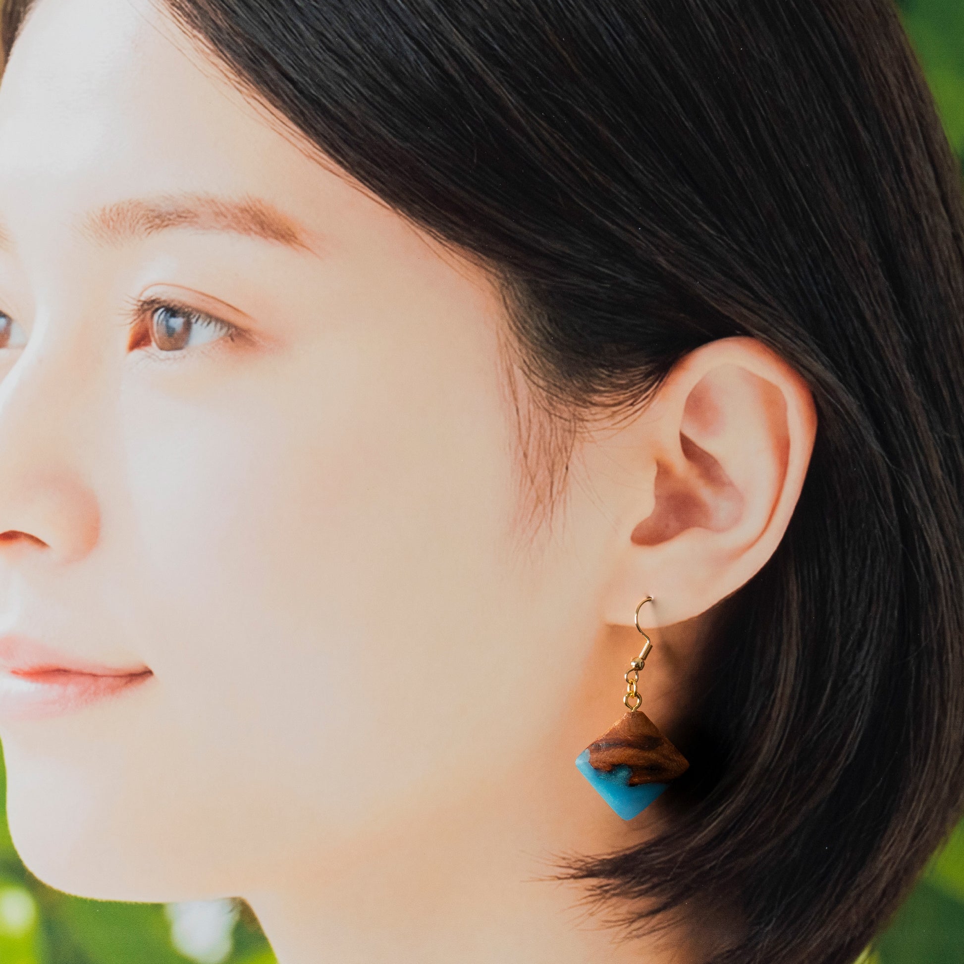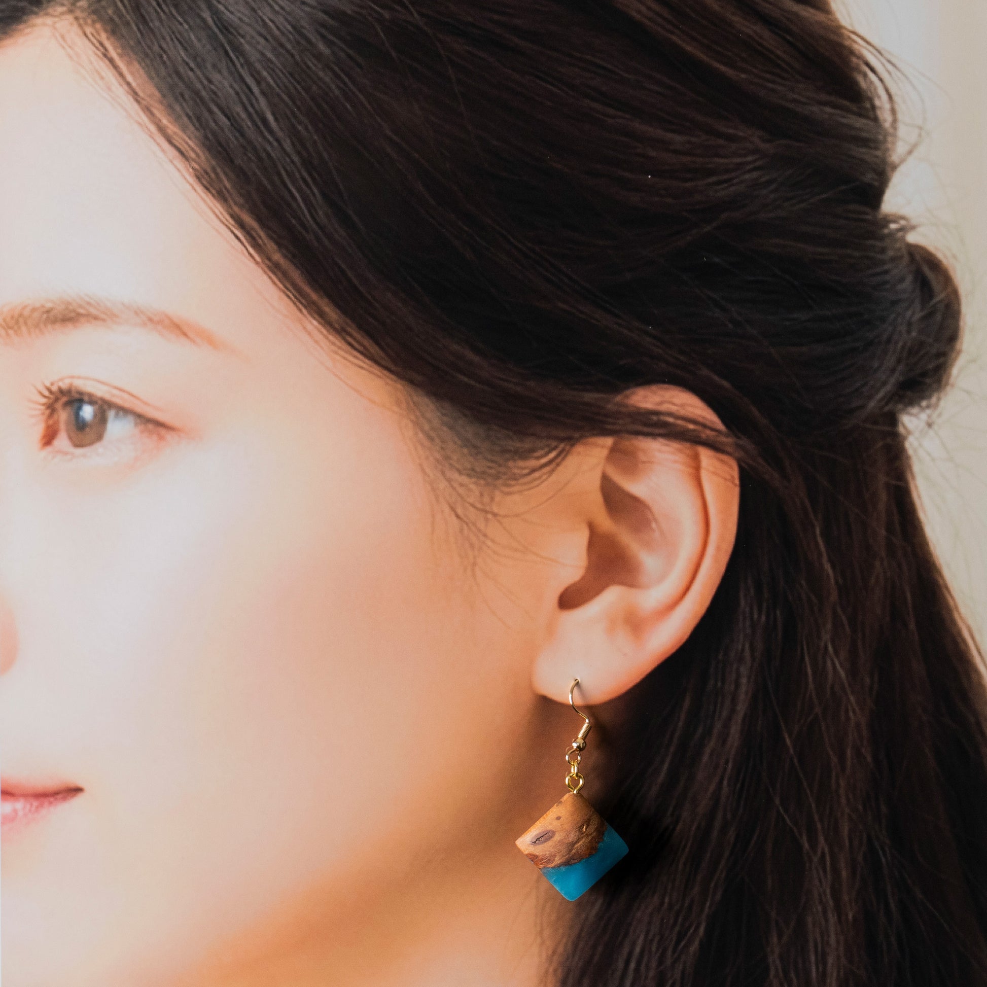 北海道産木材の木目の温かみ×レジンの透明感がまるで天然石を思わせる唯一無二の美をまとう。爽やかなターコイズブルーと瘤杢の組み合わせが目を引く一点もののピアスです。