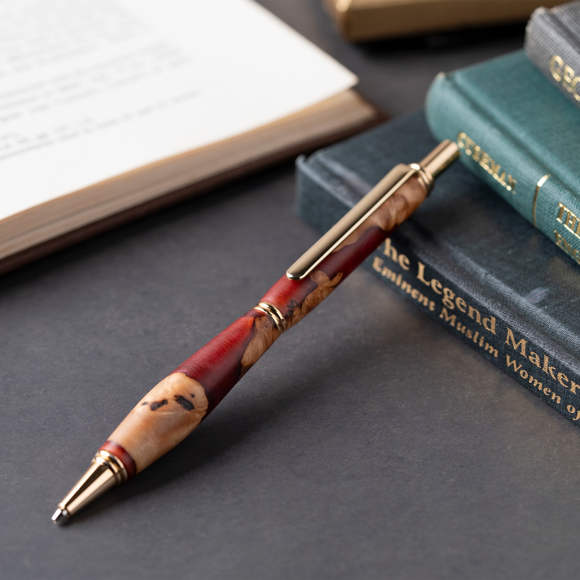 北海道道南産の瘤杢と、瘤杢×レジンの一点物の文具。(一部世界の銘木を素材にした商品もあり。)