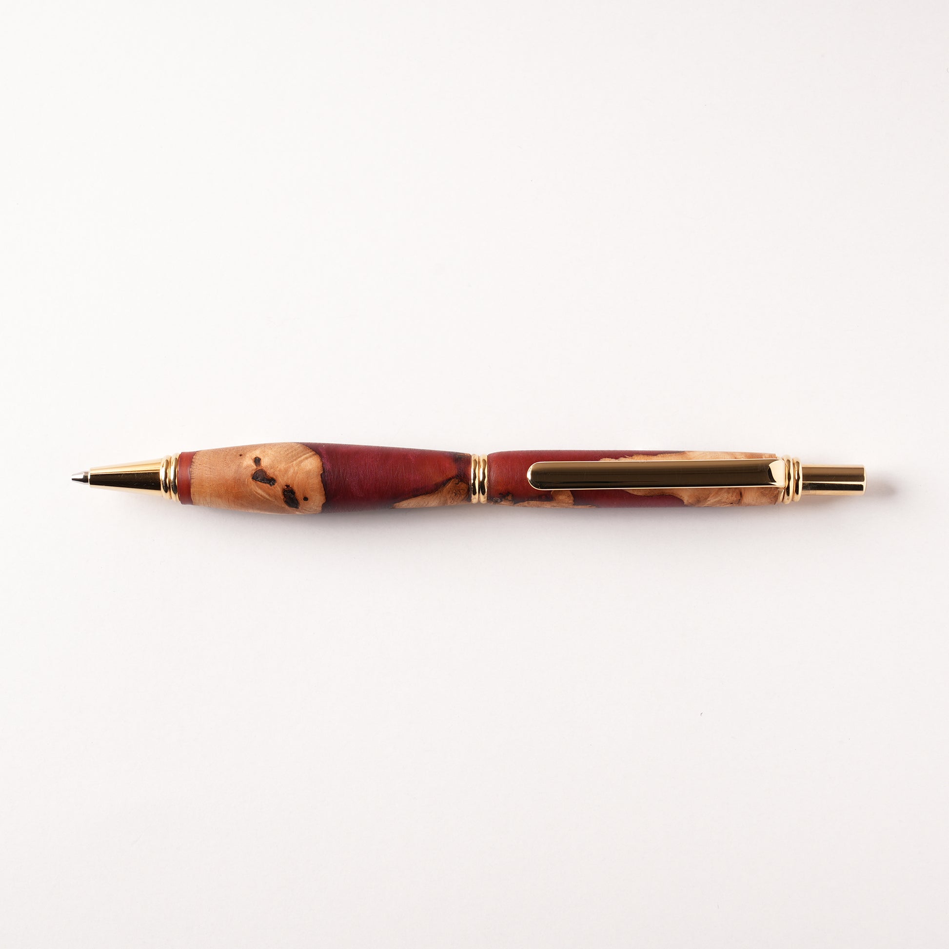 Komacraft 手元に宿る、唯一無二の輝き。 北海道の瘤杢とレジンが織りなす表情豊かな世界にひとつの文具。まるでジュエリーのような輝きが使うたび、手元に“ときめき”を添えてくれます。 瘤杢とは、樹木の表皮が変異してできた瘤(こぶ)から採れる木材の、独特で複雑な杢目模様のことです。これは、傷や病気、外的ストレスなどによって組織が異常に増殖した瘤内部の繊維が絡み合った結果として現れるものです。瘤杢の節や歪みは“欠点”ではなく木が何十年もかけて育てた表情。木目は世界にひとつしかない模様。 瘤杢は固く、硬さや繊維の方向が一定ではない為とても加工が難しい上にどの材も癖があり加工が難しいといわれています。その美しい表情を生かした瘤杢の質感に魅了される人も多いのではないでしょうか?世界に二つと同じ作品は生まれない。唯一無二の出会いをお愉しみください。